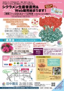 平素より田中園芸をご利用いただきまして誠にありがとうございます。 今年のシクラメンの直売所販売は、12月30日(土)までとさせていただきます。シクラメンの在庫もだいぶ少なくなっておりますので、ご購入をご希望の方は、お早め...
